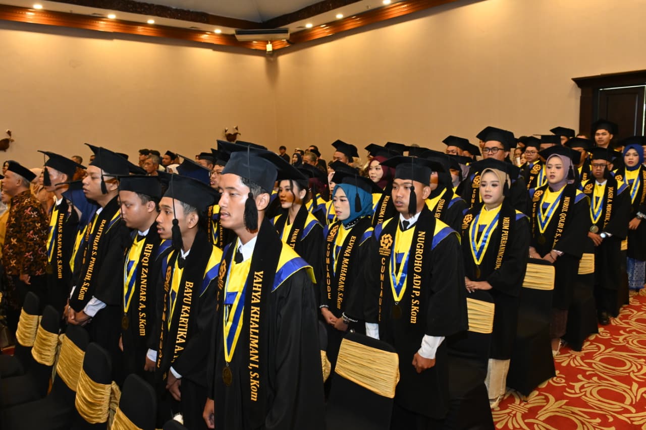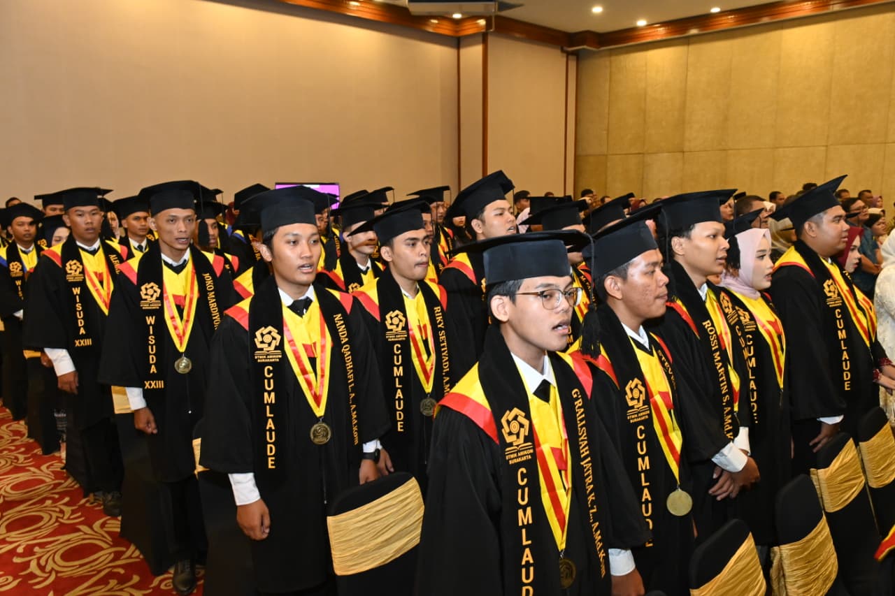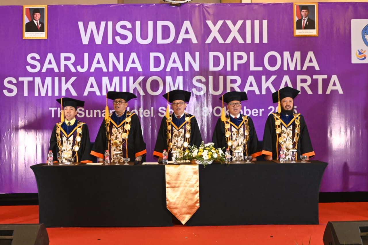 Surakarta, 18 Oktober 2025 – STMIK AMIKOM Surakarta sukses menggelar Wisuda XXIII Program Sarjana dan Diploma yang berlangsung di The Sunan Hotel Solo, yang dimulai pukul 08.00 hingga 11.00 WIB. Acara ini menjadi momen istimewa bagi 104 wisudawan/wati yang secara resmi menyelesaikan studi mereka di kampus unggulan multimedia ini. Jumlah wisudawan/wati kali ini terdiri dari 67 lulusan Program Studi S1 Informatika dan 37 lulusan Program Studi D3 Manajemen Informatika. Mereka tidak hanya menorehkan prestasi akademik, tetapi juga siap menapaki fase baru dalam kehidupan sebagai fresh graduate yang akan memasuki dunia kerja dan berkarya untuk masyarakat.